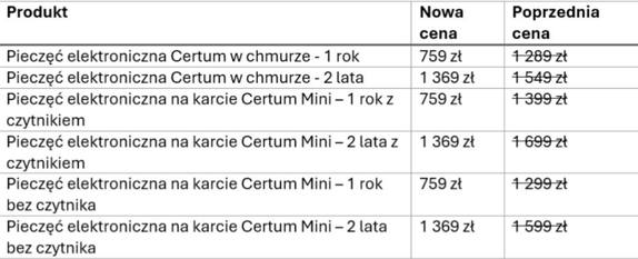 Aktualny cennik pieczęci kwalifikowanej CERTUM, ceny promocyjne, brutto, zł! :